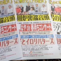 なやde春待ちコンサートポスター2月23日㈭祝なやプラザで市川美智子とイロリバターズコンサートのポスターが出来ました。本町プラザ、文化会館、文化情報スポットに掲示してもらいます。 ポケットティッシュ本町プラザ受付に置いてもらう予定のポケットティュ ...