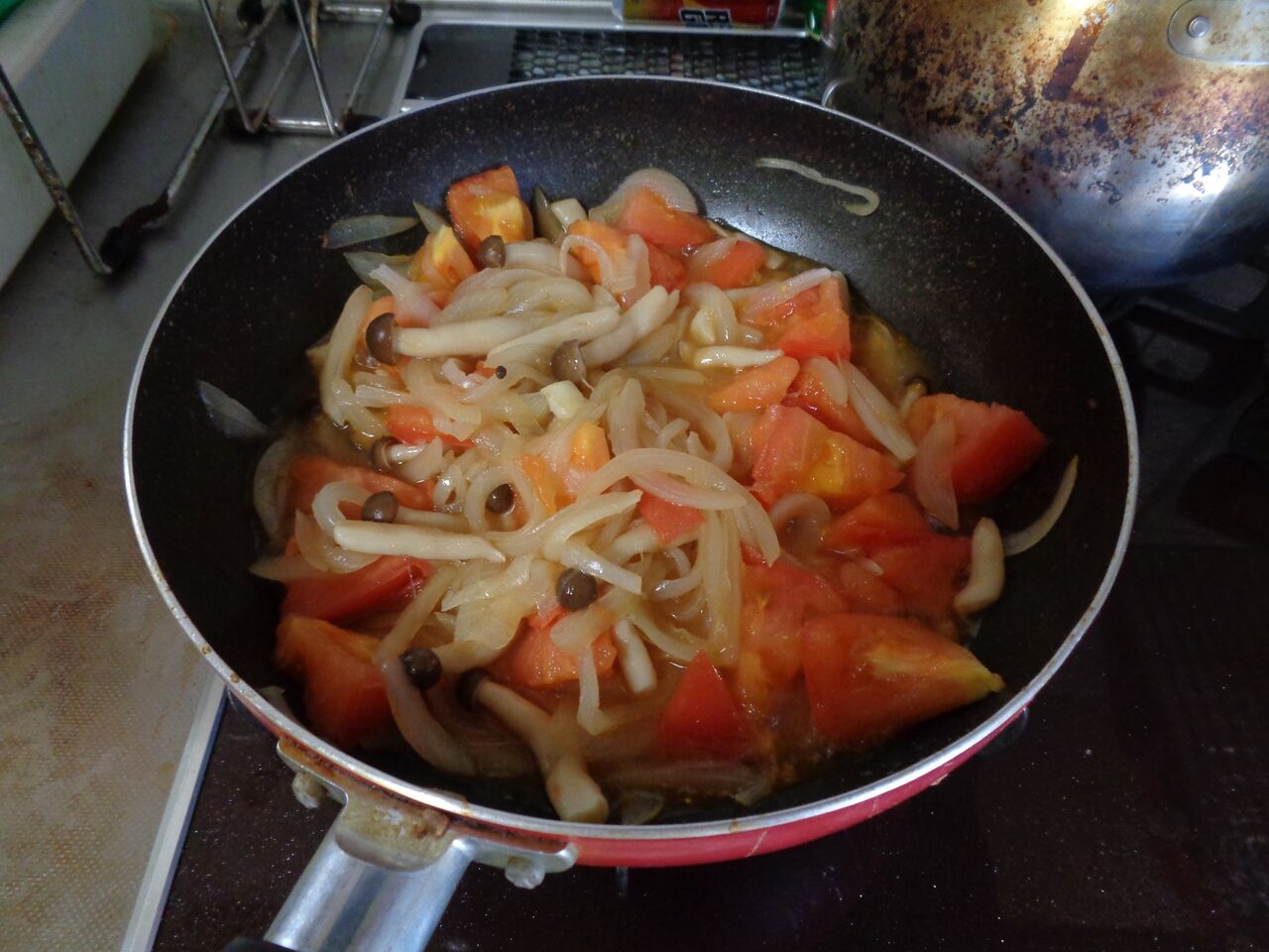 玉ねぎとトマトを炒めているところ