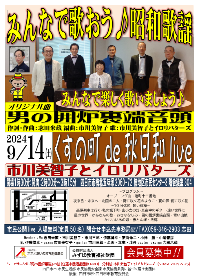 9月開催の昭和歌謡liveのポスターが出来ました。PDFにして京都の印刷会社に回します。7月の定例会には間に合うかも?